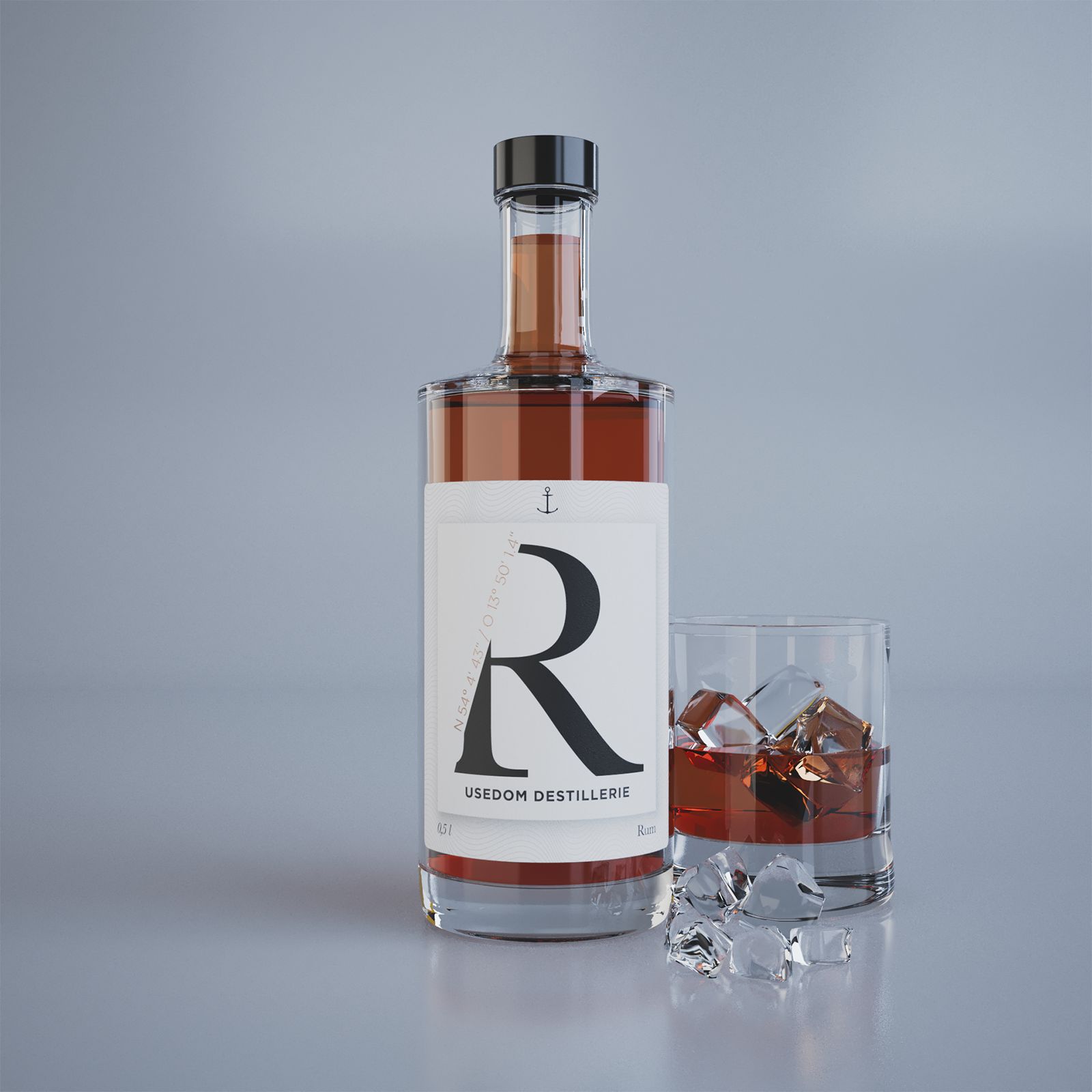 Im Auftrag der **Usedom Destillerie** entstand eine Serie von 3D-Visualisierungen verschiedener Spirituosensorten. Ziel war eine hochwertige Präsentation der Produkte mit klarer Fokussierung auf Glasmaterialien, Lichtführung und detailgetreue Etikettengestaltung.